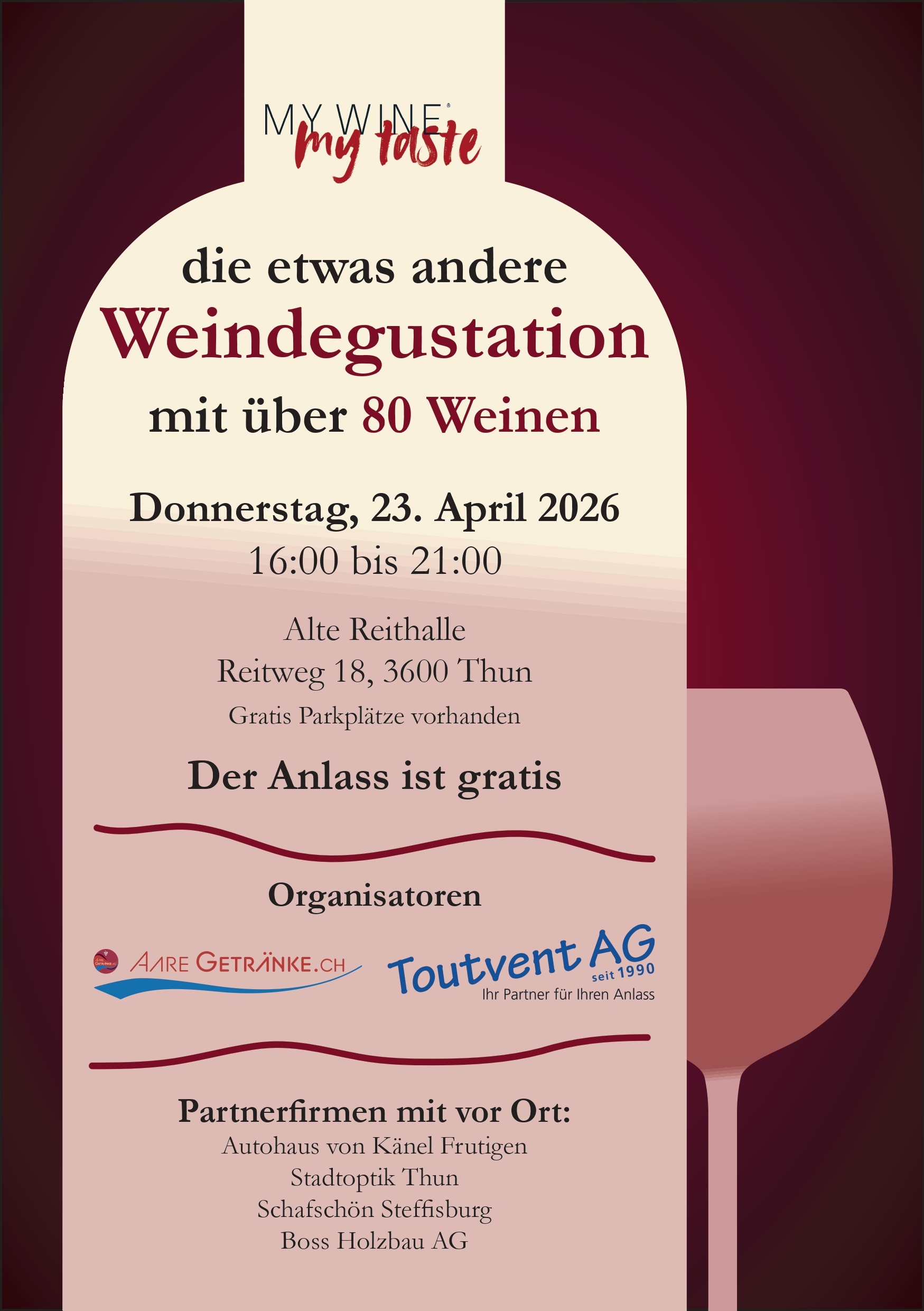Wir freuen uns, gemeinsam mit unserer Partnerfirma Aare Getränke AG auf der Alten Reithalle Thun eine Weindegustation der anderen Art durchzuführen: Sie wählen aus über 80 Weinen aus aller Welt diejenigen aus, die Sie ansprechen. Wie Sie Ihren Rundgang gestalten, ist Ihnen überlassen - wir stehen Ihnen für Ihre Fragen und Anliegen zur Verfügung. Ganz nach dem Motto "My wine - my taste".